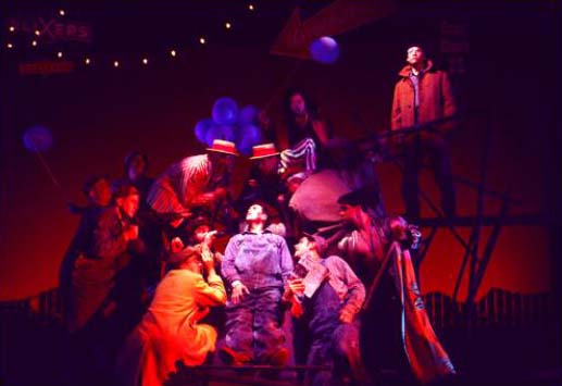 | The exposed skeletal structure of the underground world that Floyd Collins explores is a tangled jungle gym of steel and plank. As he delves deeper into the cave, the set rotates; a turntable within a turntable offering an infinite number of views and possibilities into this underground labyrinth. When Floyd gets trapped in the cave passageway, we are allowed to see the story unfolding both underground and above ground in the same moment, focusing on what we need to by rotating or revolving the set. |